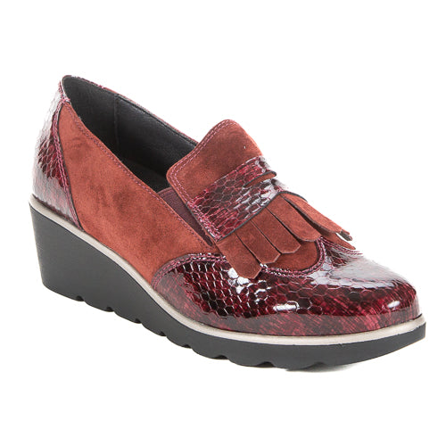 D-chicas 3745 Bordeaux anatomic slip-on shoe with "fake" buckle. There are two elastic gussets on the sides for easy and comfortable fit. The insole is soft and removable. Its shock-absorbing and non-slip black sole provides a restful and safe walking.
