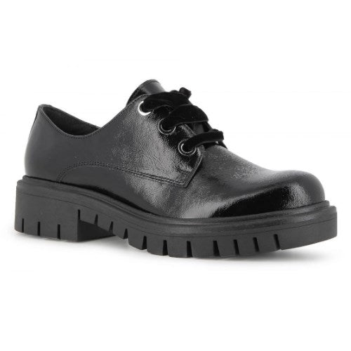 Alpina Amica 878E-1 Black Anatomic Shoe Patent Leather with black velvet laces and a unique, low heel. The upper part of the shoe is covered with an Alpitex membrane, which provides additional protection against snow, water, and frost, while also contributing to comfort in various weather conditions. The interior features a lining for pleasant warmth and softness on cold winter days. The insole is soft and cushioned, offering greater comfort while walking. The proper heel height helps maintain a natural and healthy posture. The sole is shock-absorbing and slip-resistant, providing optimal shock absorption and reliable grip for safe walking.