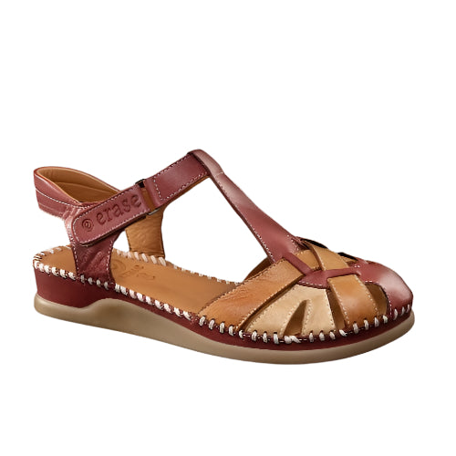 Erase Ceres 793-66 Bordeaux Anatomic Sandal with tan and beige straps at the front. The sandal is closed at the toes with perforations to allow your feet to breathe. A strap connects the front to the ankle strap, providing a secure fit. The sandal features an adjustable velcro closure for easy wear in your daily routine. The insole is exceptionally soft, while the anti-slip, shock-absorbing sole ensures lasting comfort and stability with every step.