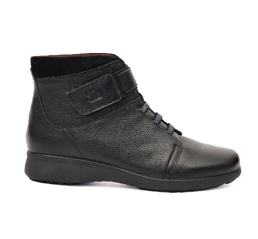 Treintas Felicia 4204 Black Anatomic Boot features elastic laces and a strap with an elastic section that ends with a Velcro fastener for quick and easy fitting on any foot. The insole is removable and soft. The sole is slip-resistant and shock-absorbing, providing comfort and safety with every step.