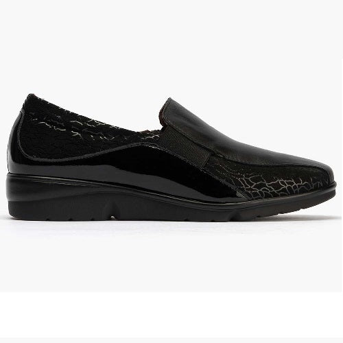 Pitillos Flexy 10000 Black anatomic slip-on shoe with three different patterns, creating a beautiful and stylish effect. The shoe is very lightweight and soft on the upper, gently hugging feet with special needs. It features with two elastic gussets on the sides for easy and comfortable fit.The insole is soft and removable. Its shock-absorbing and non-slip sole provides a restful and safe walking. Pitillos uses cutting-edge insoles in its footwear. With absorbent tissues and antibacterial treatment, they keep your feet ventilated. The use of thermoregulatory material offers greater comfort and breathability, while also eliminating odors and keeping your feet dry with an absorption system superior to that of skin. Made in Spain.