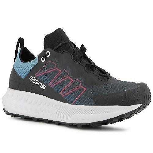 Alpina Madeira 655K-3 Black-Blue Anatomic Athletic Shoe with pink details. It features laces for a better fit on each foot. The diamond-patterned upper material ensures optimal breathability, keeping your feet cool and comfortable throughout your adventure. The removable insole, along with the EVA arch construction underneath, provides excellent traction and support. Designed specifically for off-road adventures, the Madeira trail running shoes offer superior grip, stability, and protection on rugged terrain. Built for optimal performance on tough surfaces, these shoes feature a durable, hard sole with a deep tread pattern made from resilient rubber, offering exceptional traction on loose or slippery surfaces. The specialized shock-absorbing protection ensures a smooth and comfortable run, even on challenging paths.