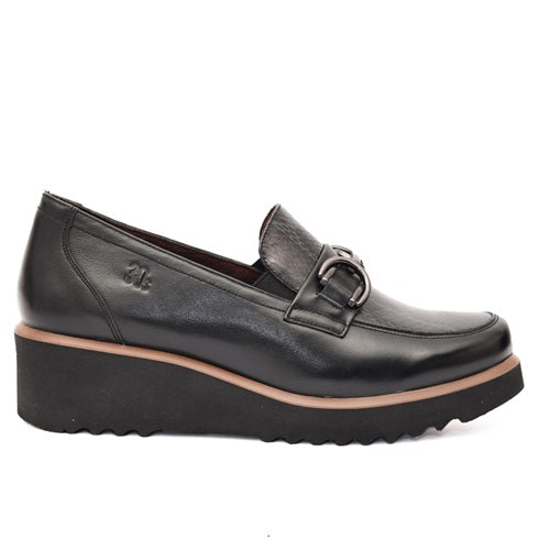 Treintas Rachel 4230 Black Anatomic Shoe with brown detailing around the sole. The upper features a snake-effect texture and is adorned with a metal buckle, while the sides have two elastic inserts for an easy fit on every foot. The insole is soft and removable with padding for added comfort. Its shock-absorbing and non-slip sole provides a restful and safe walking experience.
