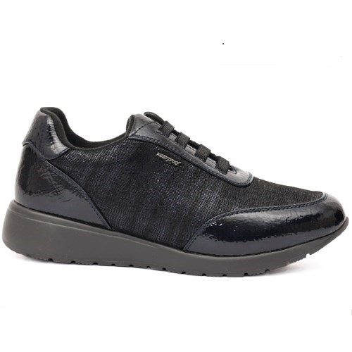 Treintas Rania L-4261 Blue Anatomic Shoe with two different patterns featuring a shine and patent finish. It has elastic laces on the upper part and a zipper on the side for quick and easy fitting. The insole is removable with memory comfort foam technology. This unique material has the ability to adapt to the different pressures applied to the feet and hug the footbed. Its shock-absorbing and non-slip sole provides a restful and safe walking experience. The shoe is very light and soft.