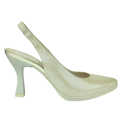Desiree Sami1 Champagne Anatomic Sandal with a subtle shimmer, closed at the toes and open at the heel. The back features an elastic insert to ensure a better fit for every foot. The soft insole, combined with a cushioned metatarsal pad and Total Flex technology, provides increased comfort, excellent flexibility, and effective shock absorption. The sole is anti-slip and shock-absorbing, offering stability and comfort with every step.