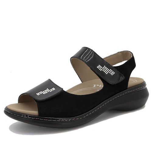 PieSanto Sati 240820-782H Black Anatomic Sandal with rhinestone designs. Features two upper patent-finish straps with adjustable Velcro fastenings, one at the toes and one at the instep, for a secure and personalized fit. Both straps are decorated with playful rhinestone patterns that add a touch of sparkle, making the sandal stand out and brighten your mood with every step. The insole is removable. The package also includes two additional half insoles that can be placed at the front if needed, for improved comfort and support. The sole is anti-slip, ensuring stability and safety with every step.