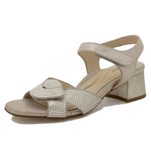 PieSanto Smoke 250025-615G Rose Gold Anatomic Sandal with two upper straps featuring adjustable Velcro fastenings for a secure and personalized fit. The front is adorned with shiny, irregular-shaped decorative elements, adding a touch of elegance. The insole is soft and provides support to the heel, arch, and metatarsal area. Features a distinct, chunky heel for added style and stability. The sole is anti-slip, ensuring safety and confidence with every step.